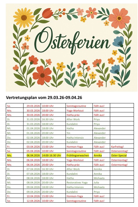 Hallo ihr Lieben, in den Osterferien ist vieles anders, aber wir haben es wieder geschafft, einen tollen Vertretungsplan zu erstellen. Das Team wünscht euch viel Freude beim Yoga... Michi